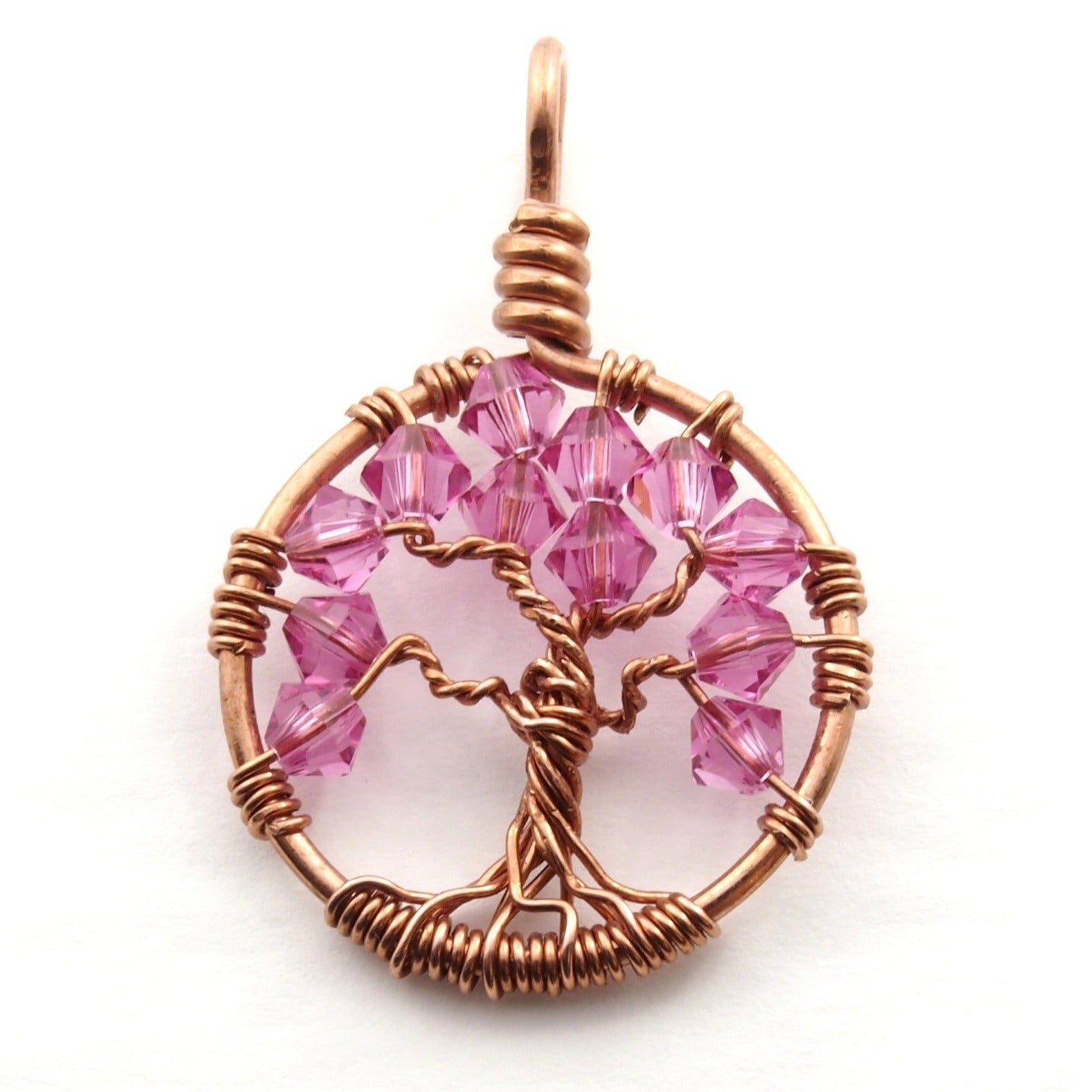 A handmade wire wrapped tree of life necklace beaded with beaded with 12 dazzling Swarovski® crystals in Rose. You can choose between sterling silver or copper wire for your pendant.